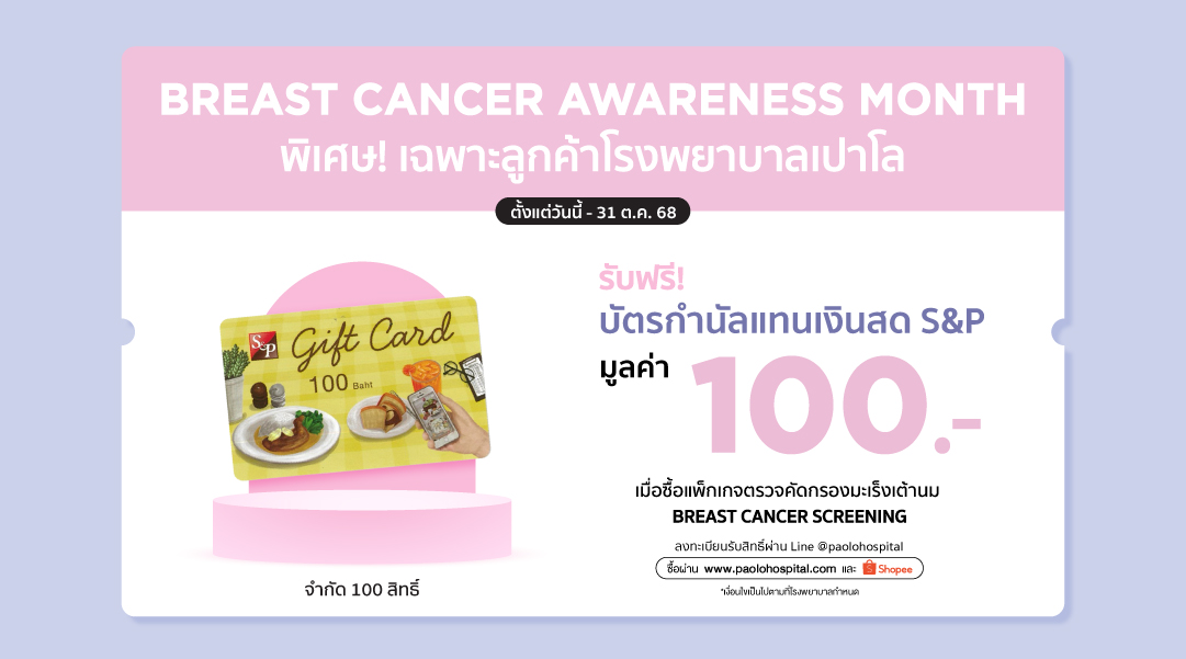 - เมื่อซื้อแพ็กเกจ Breast Cancer Screening รับบัตรกำนัลแทนเงินสด S&P มูลค่า 100 บาท (จำกัด 100 สิทธิ์แรกที่ลงทะเบียน)