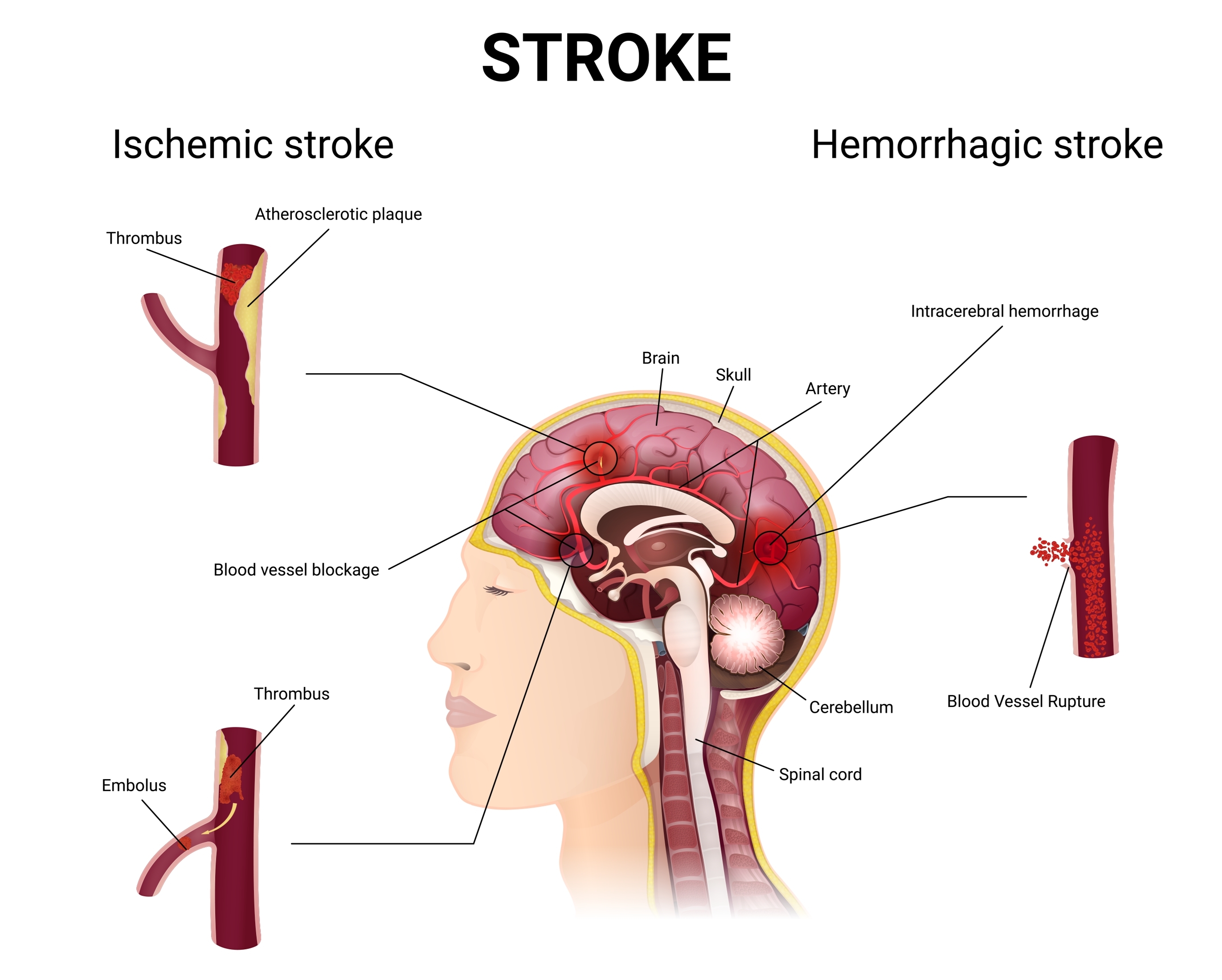 โรคหลอดเลือดสมองเกิดจากการที่เลือดไม่สามารถไปเลี้ยงสมองได้เพียงพอ ส่งผลให้เซลล์สมองตายและทำงานผิดปกติ แบ่งออกเป็น 2 ประเภทหลัก ได้แก่