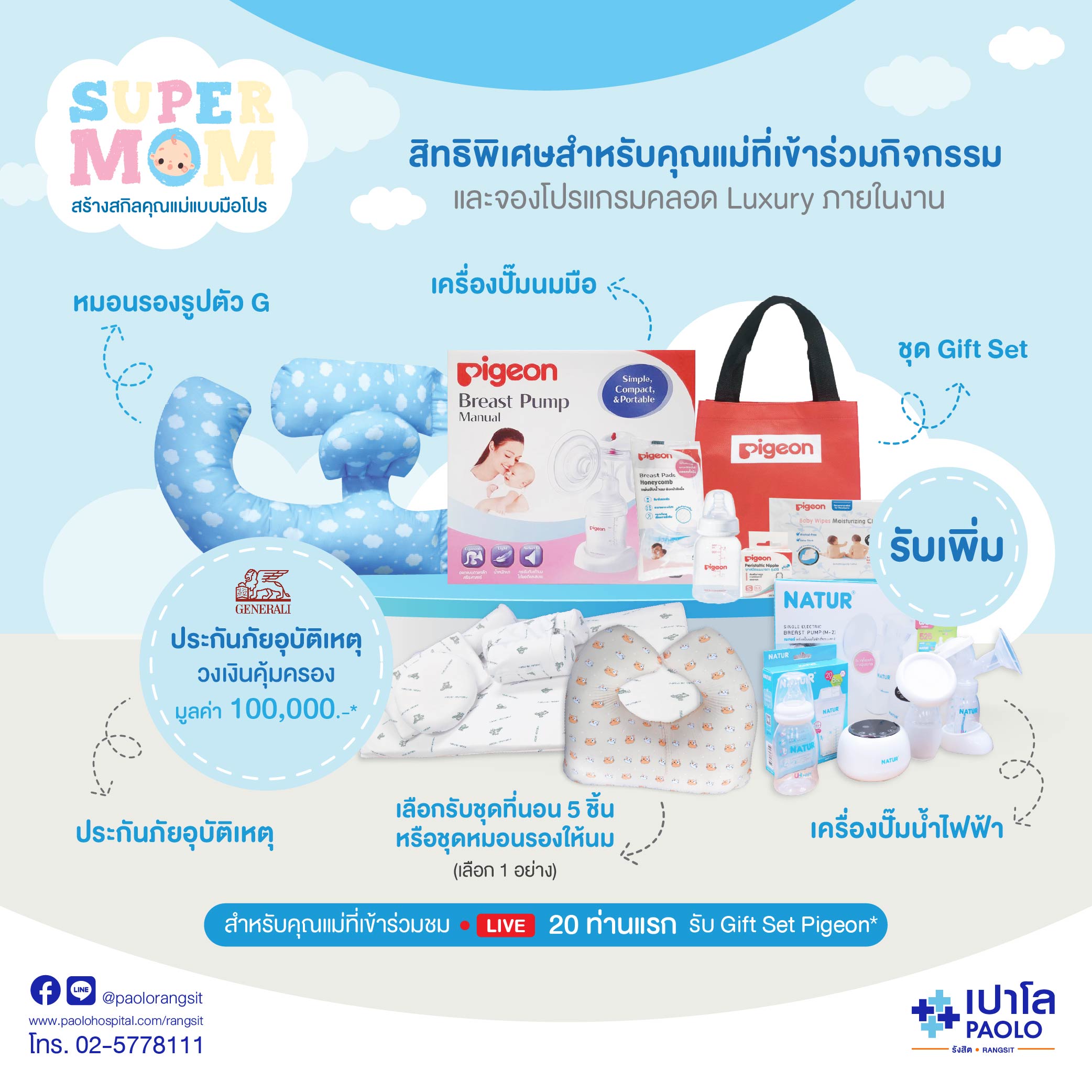 - ซื้อจองโปรแกรมคลอดภายในงานจะได้รับประกันภัยอุบัติเหตุส่วนบุคคล จากบริษัท เจนเนอราลี่ ประกันภัย (ไทยแลนด์) จำกัด (มหาชน) เป็นระยะเวลา 3 เดือน วงเงินคุ้มครอง 100,000 บาท ค่ารักษาพยาบาลอุบัติเหตุแต่ละครั้งสูงสุดไม่เกิน 2,000 บาท (สำรองจ่าย)